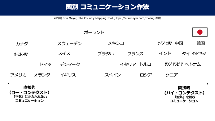 ある国について「ハイコンテクスト」か「ローコンテクスト」かを見る上で大切なのは、あくまで比較対象によって答えが異なるということです。